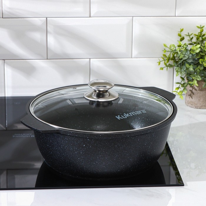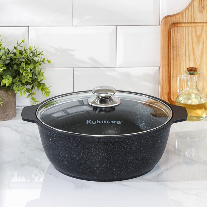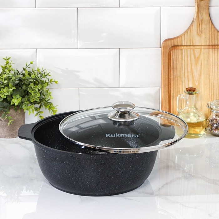 Кастрюля-жаровня Kukmara сделана из литого алюминия. Имеет инновационное антипригарное мраморное покрытие на водной основе, которое изготовлено по немецкой технологии (Weilburger Coatings GmbH) и усилено сверхтвёрдыми частицами минералов.