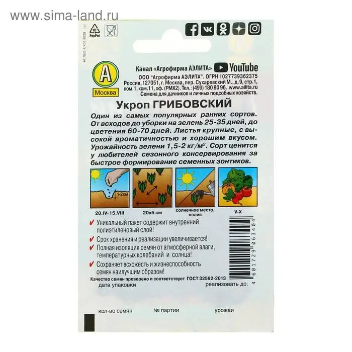 «Грибовский» — это среднеспелый сорт укропа, который подходит для выращивания в открытом и защищённом грунте. Период от всходов до уборки на зелень составляет 30–40 дней, на специи — 85–100 дней.