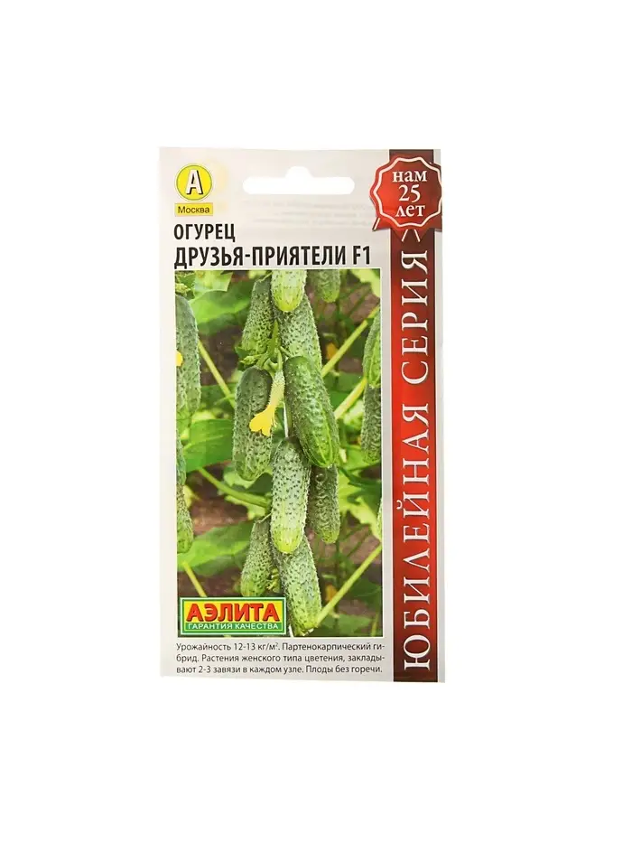 «Друзья-приятели» — это ультраранний партенокарпический сорт для открытого грунта (урожайность — 7,5 кг/м²) и плёночных укрытий (13 кг/м²). Плодоношение начинается на 39–45 день от всходов.