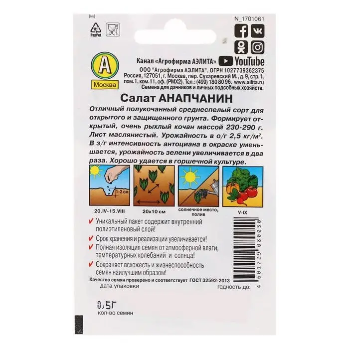 Семена Салат "Анапчанин" полукочанный "Лидер", 0,5 г ,