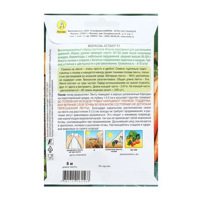 Посев: почву разрыхляют. Ленту помещают в хорошо увлажненные бороздки на подготовленной грядке, на глубину 1,5-2 см и засыпают грунтом, поливают. Благодаря идеальному расположению семян на ленте (на расстоянии 3-3,5 см) всходы не требуют прореживания, и растения могут равномерно развиваться. Это сводит к минимуму повреждение корнеплодов морковной мухой, так как ее привлекает запах морковной ботвы, усиливающийся при прореживании. Дальнейший уход заключается в прополках, поливах и рыхлении почвы. Наслаждайтесь сладкой и здоровой морковью со своего огорода.