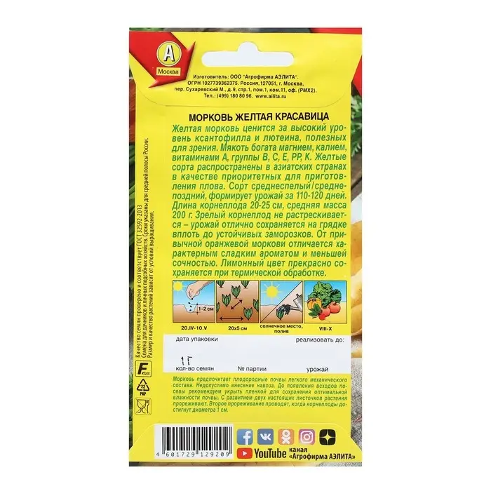 Желтая морковь ценится за высокий уровень ксантофилла и лютеина, полезных для зрения. Мякоть богата магнием, калием, витаминами А, группы В, С, Е, РР, К. Желтые сорта распространены в азиатских странах в качестве приоритетных для приготовления плова. Сорт среднеспелый / среднепоздний, формирует урожай за 110-120 дней. Длина корнеплода 20-25 см, средняя масса 200 г. Зрелый корнеплод не растрескивается – урожай отлично сохраняется на грядке вплоть до устойчивых заморозков. От привычной оранжевой моркови отличается характерным сладким ароматом и меньшей сочностью. Лимонный цвет прекрасно сохраняется при термической обработке.
