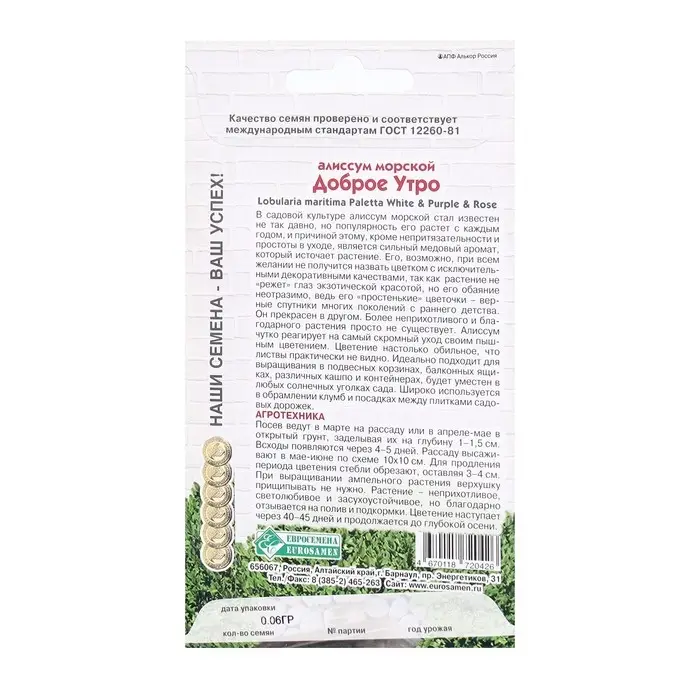 Семена Цветов Алиссум морской Доброе Утро, 0,06 г
