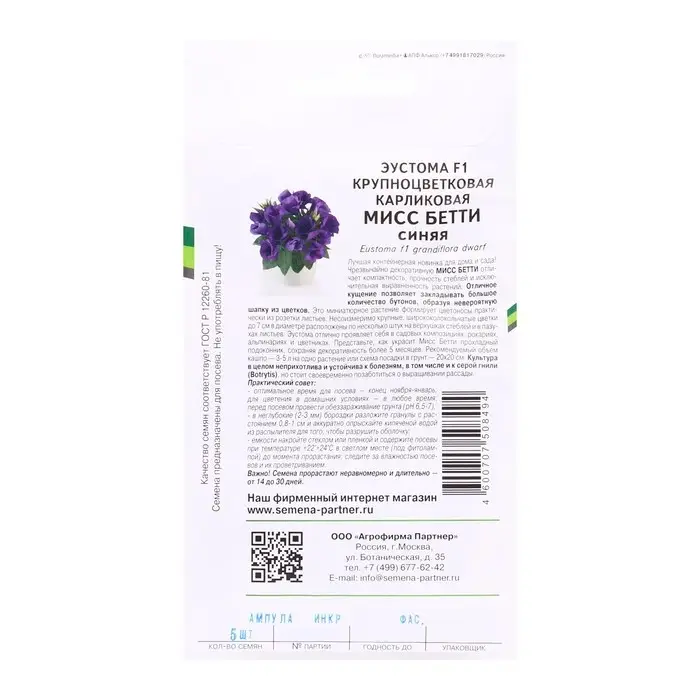 Семена Эустома "Мисс Бетти", F1, карликовая, синяя, 5 шт
