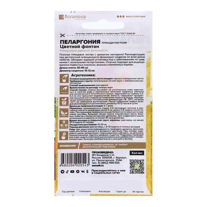 Роскошная каскадная пеларгония, выращиваемая из семян. Низкорослые растения, высотой до 10 см, образуют множество сильноветвящихся побегов длиной до 40 см с яркими соцветиями различной окраски. Побеги достаточно крепкие, способные по мере роста цепляться за уступы каменистых склонов и карабкаться вверх. Используется для вертикального озеленения, прекрасно смотрится в контейнерах и кашпо. Высаженная в балконный ящик, вазон, на клумбу возле дома, пеларгония демонстрирует великолепное цветение в тёплый период года. Одно из самых неприхотливых растений, уход за которым не требует значительных усилий. Пеларгония светолюбива, легко переносит недостаток влаги. Предпочитает влагоёмкую рыхлую питательную почву с чуть кислой или нейтральной реакцией. Семена на рассаду высевают с января по сентябрь. Глубина заделки – 0,5-1,0 см. Для получения наилучшего результата посев рекомендуем проводить в торфяные таблетки (одно семя в таблетку). Посевы накрывают пленкой или стеклом и ставят в светлое теплое место. При температуре +20-21°С всходы появляются на 7-14 день. В период короткого светового дня им требуется досвечивание фитолампой, при недостаточном освещении они могут вытянуться. В фазе 2-3-х настоящих листьев сеянцы пикируют в отдельные горшки, обеспечив дренаж. В сад растения можно высаживать с конца мая, когда минует угроза заморозков. Посадочный интервал – 30-40 см. Для увеличения количества побегов и лучшего кущения в фазе 4-5 пар листьев проводят формирующую прищипку. В теплое время года растениям необходим обильный полив, зимой поливают умеренно. Для обильного и продолжительного цветения необходимо своевременно удалять увядающие соцветия и листья, после цветения проводить подкормку комплексными минеральными удобрениями, а также микроудобрениями, особенно важны магний и йод.