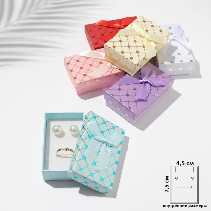 С нашими прекрасными коробочками любой подарок станет еще лучше и ярче. Футляр выполнен из прочного плотного картона. Оптимальный размер коробки 5*8см позволяет разместить разнообразные виды ювелирных изделий – от сережек до колье. Внутри каждой коробочки с крышкой есть белая бархатная подложка. С помощью специальных прорезей на подушечке можно аккуратно разместить и зафиксировать цепочки, гвоздики и перстни. А если убрать подложку, упаковка подойдет даже для часов с мягким плоским ремешком или на цепи.