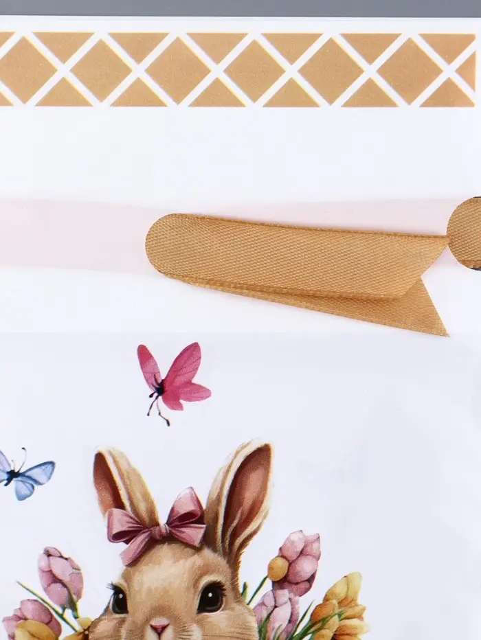 - Украшен тематическим декором с изображением зайца и цветов.