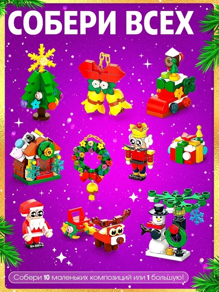 - 11 разных моделей в одном наборе: из деталей получается собрать десять небольших праздничных фигурок или один большой комплекс. Ребёнок может построить Щелкунчика, нарядную елку, Снеговика, Оленя с санями, Деда Мороза, подарочную коробку и другие новогодние атрибуты. Это много часов увлекательной игры.