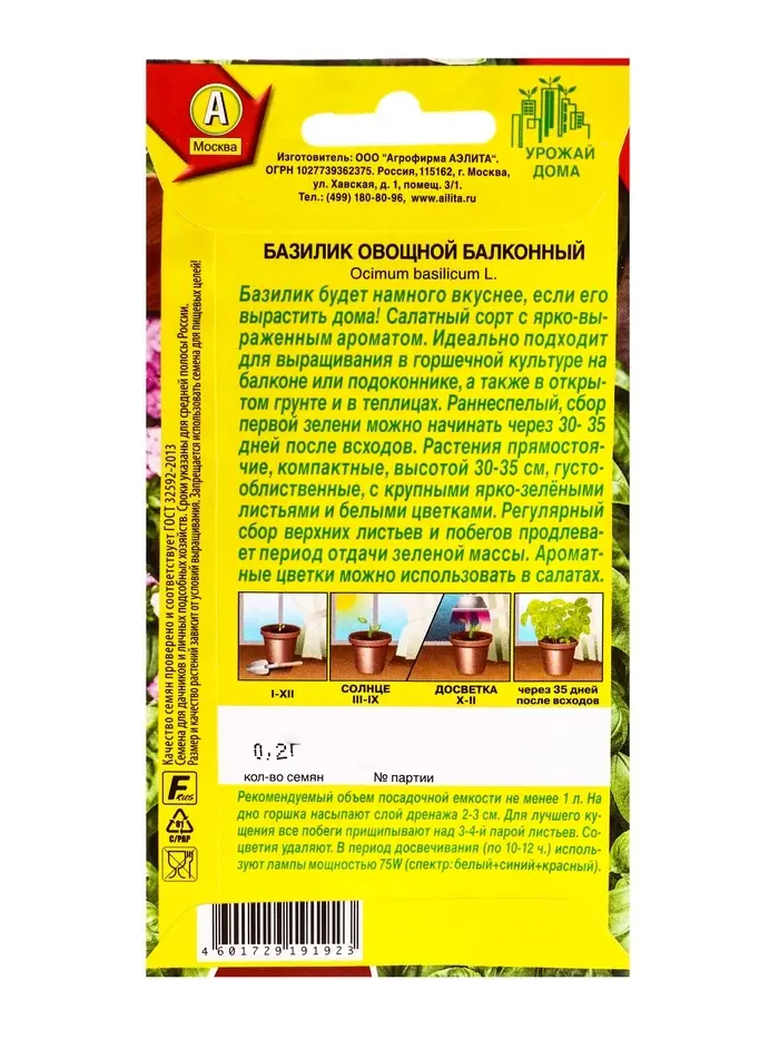 Семена Базилик овощной Балконный Урожай дома, Ц/П,0,2 г