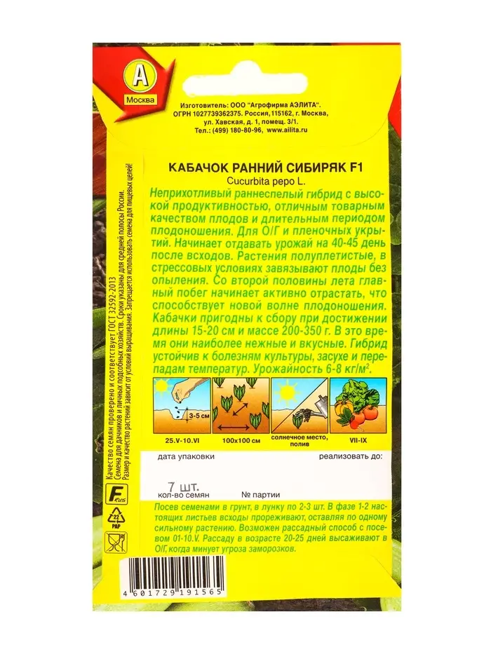 Семена Кабачок цуккини Ранний сибиряк F1, Ц/П,7 шт.