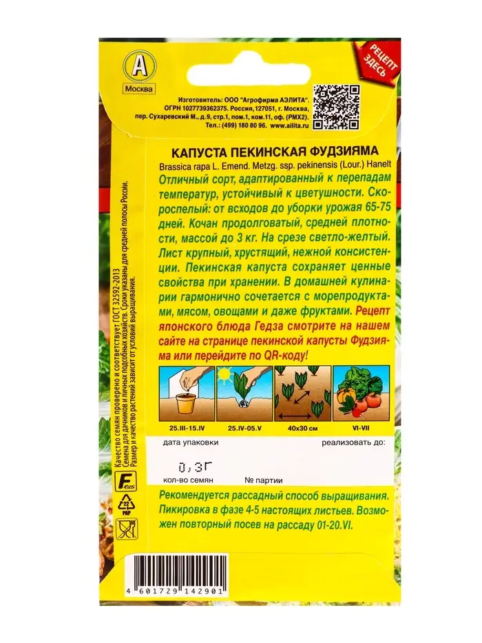 Семена Капуста пекинская Фудзияма Ср Блюда стран мира, Ц/П,0,3 г
