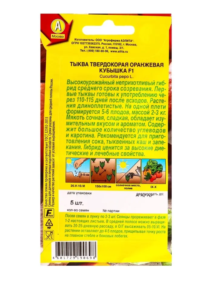 Семена Тыква твердокорая Оранжевая кубышка F1, Ц/П,5 шт.