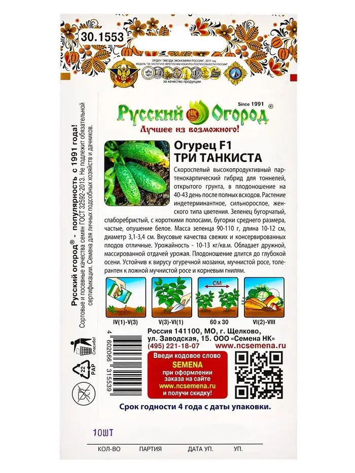 Семена Огурец "Три Танкиста" F1, серия Русский огород, скороспелый, партенокарп, 10 шт