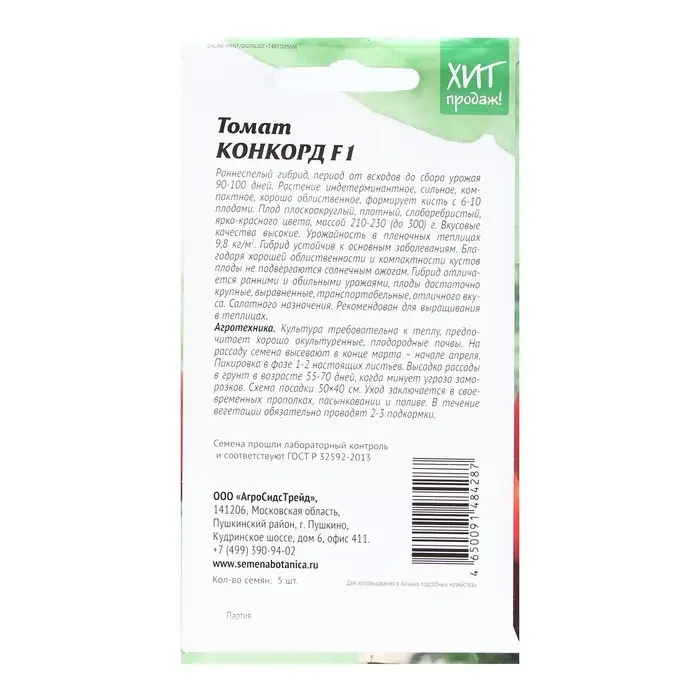 Раннеспелый гибрид, период от всходов до сбора урожая 90-100 дней. Ростение индетерминантное, сильное, компактное, хорошо облиственное, формирует кисть с 6-10 плодами, Плод плоскоокруглый, плотный, слаборебристый, ярко-красного цвета, массой 210-230 (до 300) г. Вкусовые качества высокие. Урожайность в пленочных теплицах 9.8 кг/м". Гибрид устойчив к основным заболеваниям. Благодаря хорошей облиственности и компактности кустов плоды не подвергаются солнечным ожогам. Гибрид отличается ранними и обильными урожаями, плоды достаточно крупные, выравненные, транспортабельные, отличного вкуса. Салатного назначения, Рекомендован для выращивания в теплицах.
