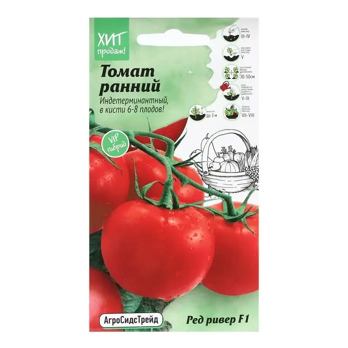 Ред Ривер F1 – ранний индетерминантный гибрид томата (85-95 дней от всходов до начала созревания). Рекомендуется для выращивания в первом и втором обороте пленочных теплиц. Мощная, активная корневая система. Растение сильное, хорошо облиственное, лист от среднего до крупного, темно-зеленый, расположение полугоризонтальное. Первое соцветие закладывается над 9-11 листом, последующие через 3 листа. Соцветие простое, компактное с 6-8-ю плодами. При повышенных ночных температурах возможна закладка кистей промежуточного типа.