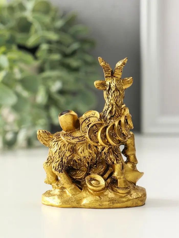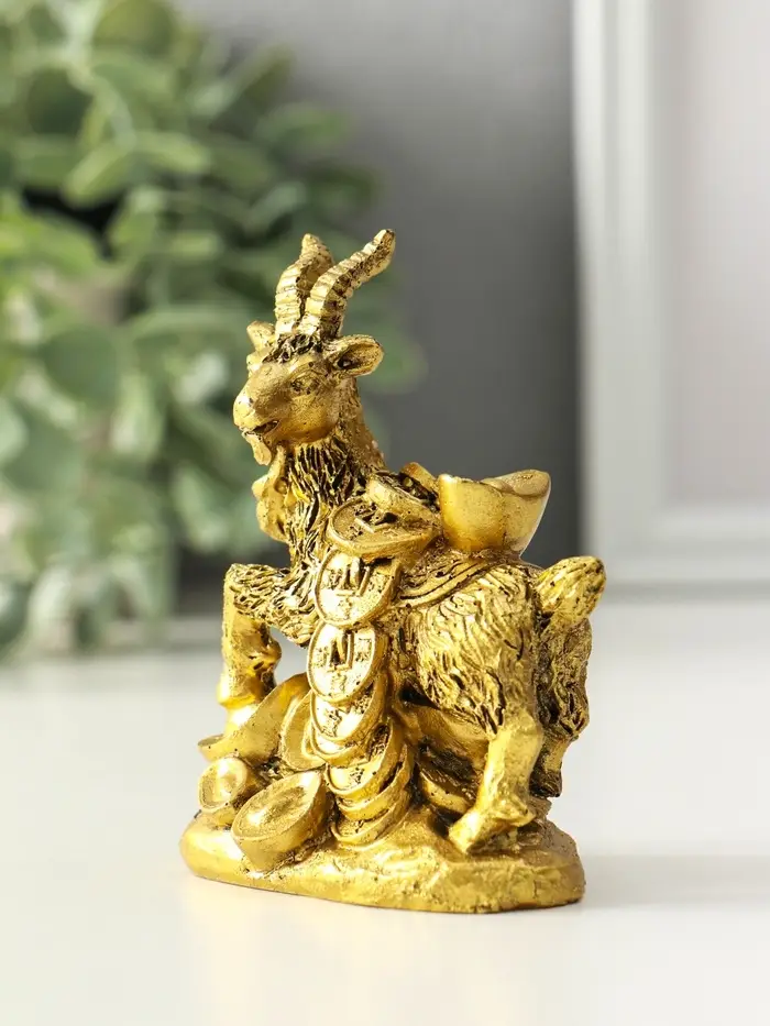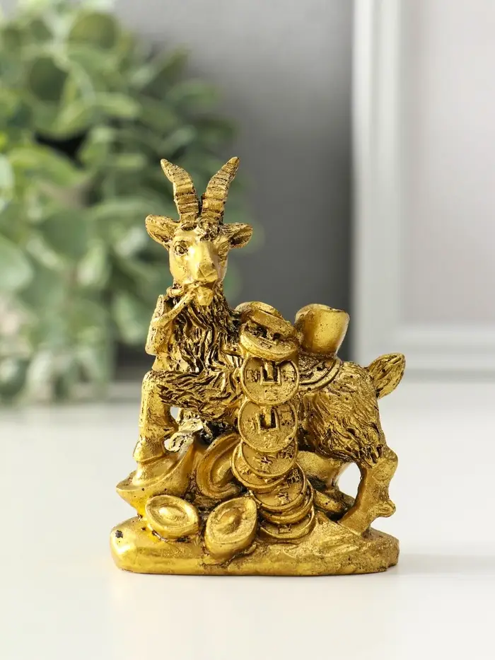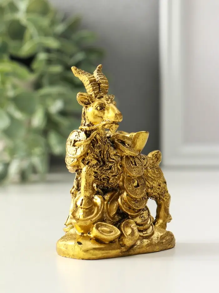 Нэцкэ полистоун "Козёл с китайскими монетами и золотыми слитками" бронза 4,2х7х9,4 см