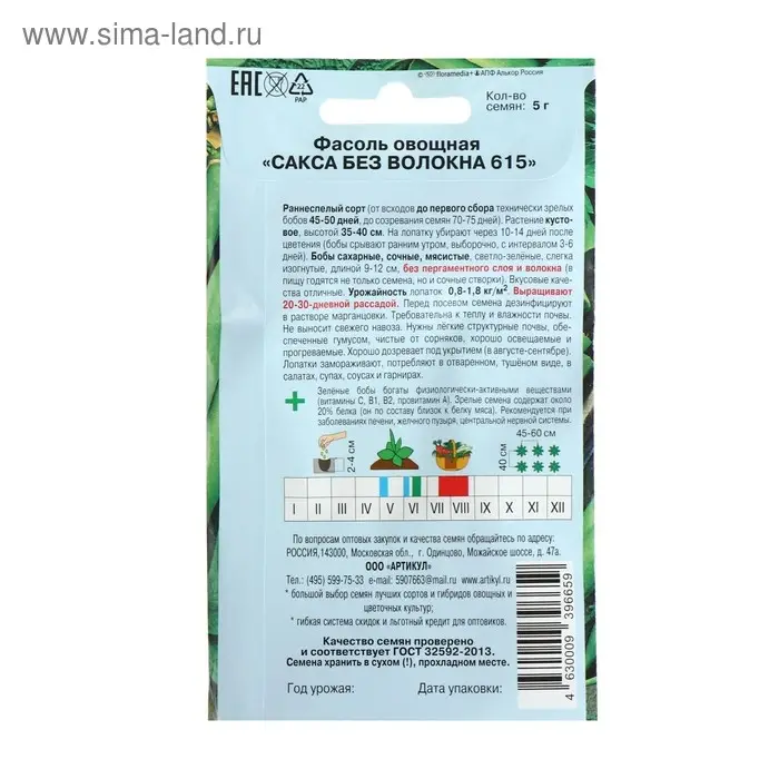 Семена Фасоль овощная «Сакса без волокна 615» скороспелая, 5 г.