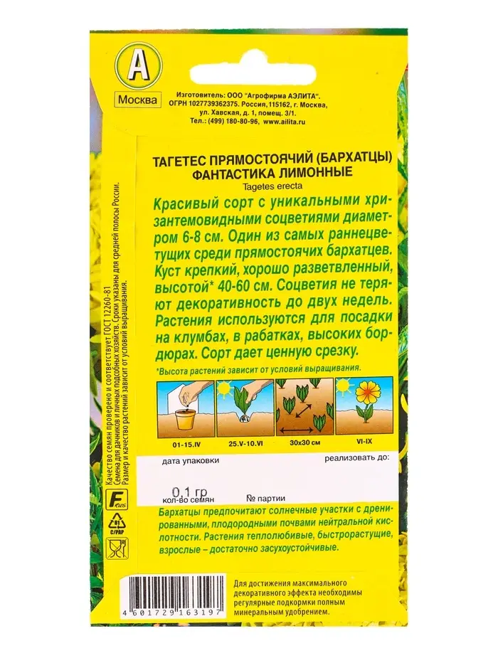Семена цветов Бархатцы Фантастика лимонные , Ц/П,0,1 г