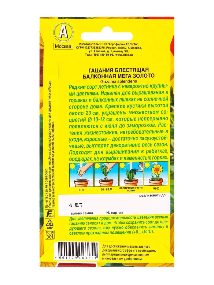 Семена цветов Гацания Балконная мега золото Цветущий балкон, Ц/П,4 шт.