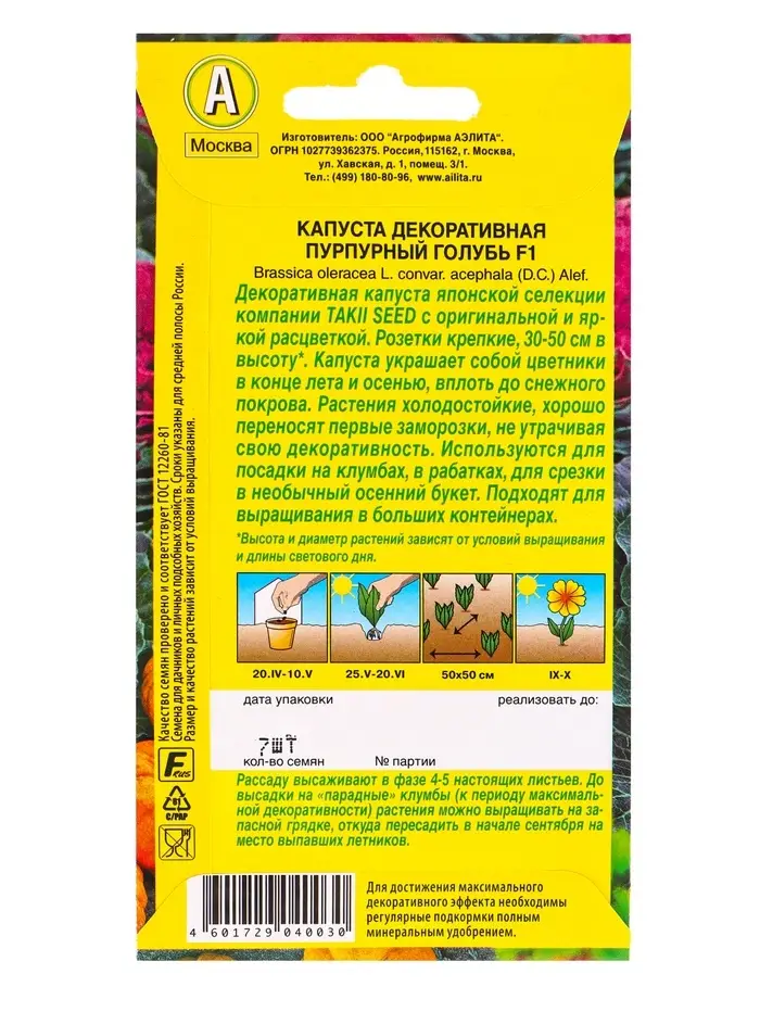 Семена цветов Капуста декоративная Пурпурный голубь F1 С. Takii Seed, Ц/П,7 шт.