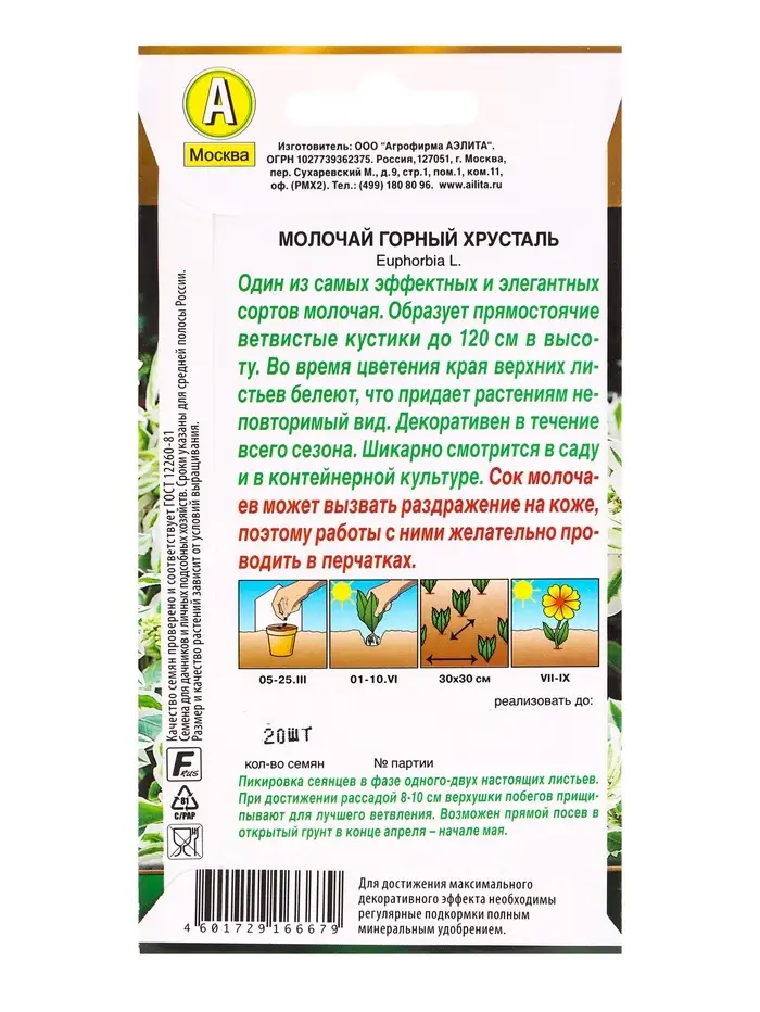 Семена цветов Молочай Горный хрусталь Золотая серия, Ц/П,20 шт.