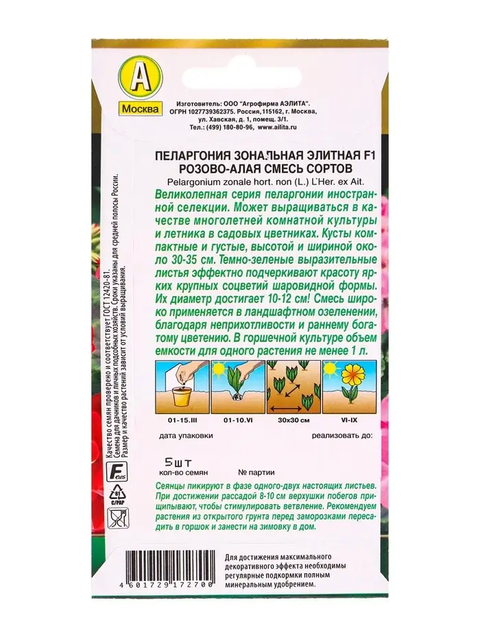 Семена цветов Пеларгония Элитная F1 розово-алая, смесь сортов Мн Золотая серия, Ц/П,5 шт.