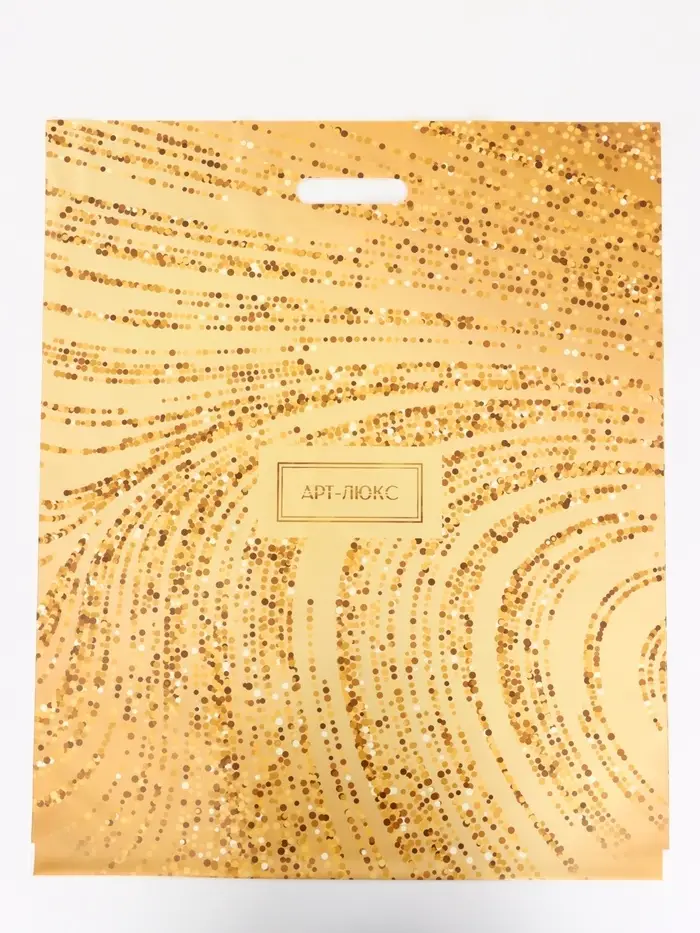 Презентационная упаковка для особых случаев Пакет «Арт-люкс» с золотистым орнаментом подходит для торжественных подарков. Крупный формат и повышенная плотность полиэтилена создают эффект статусной упаковки.