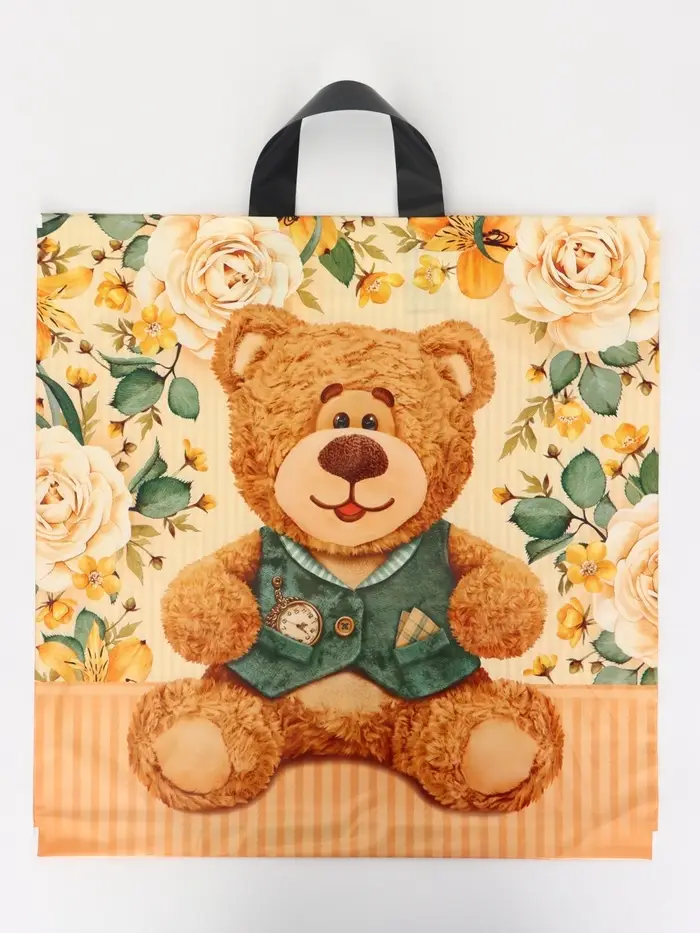 Для детских магазинов и семейных праздников: Донная складка обеспечивает устойчивость во время игр с подарком. Бежевый фон маскирует мелкие загрязнения. Пакет используют для упаковки развивающих наборов, конструкторов, мягких игрушек и праздничных аксессуаров. Петлевая ручка удобна для детей младшего возраста.