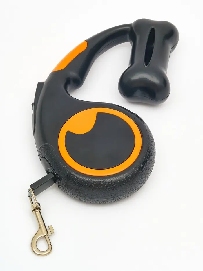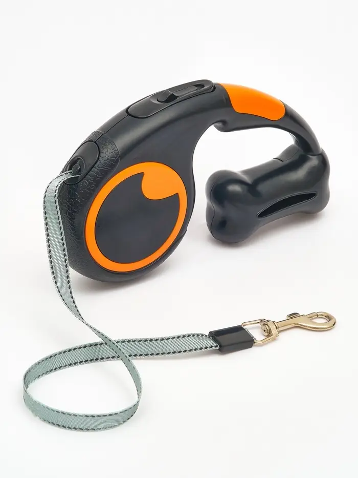 Рулетка - поводок "Косточка", с контейнером для пакетов, трос 3 м, чёрная/оранжевая