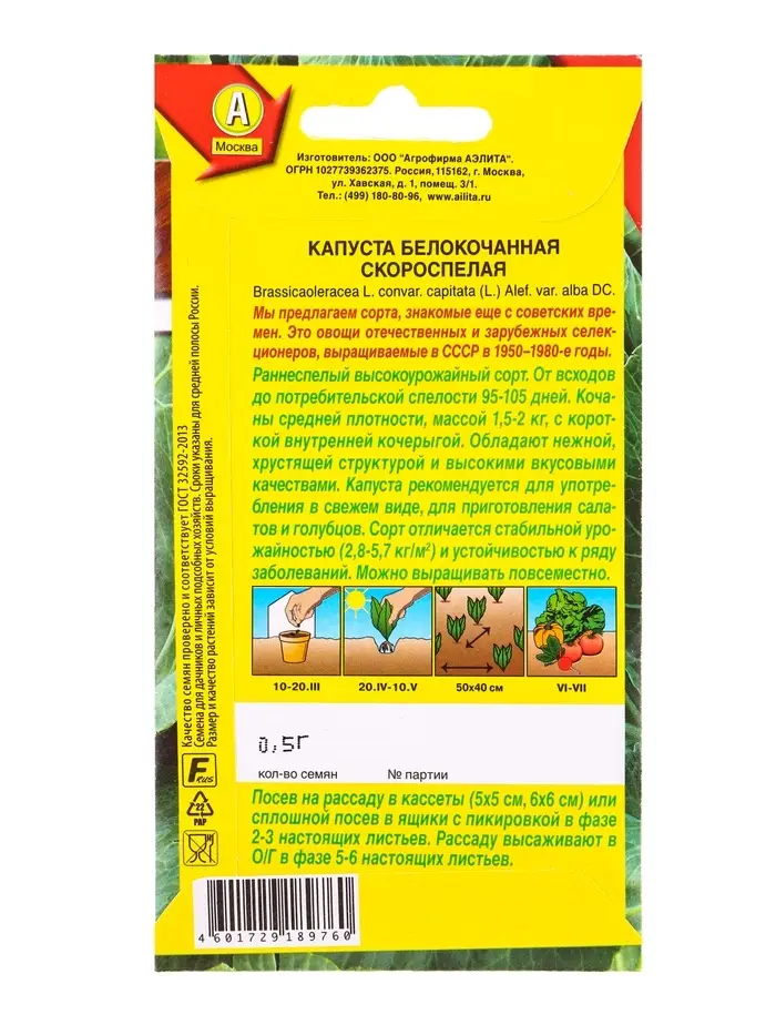 Семена Капуста б/к Скороспелая Р Сделано в СССР, Ц/П,0,5 г