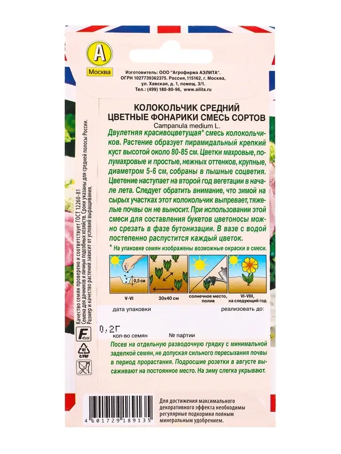 Семена цветов Колокольчик Цветные фонарики, смесь сортов Дв Британская коллекция цветов, Ц/П,0,2 г 1