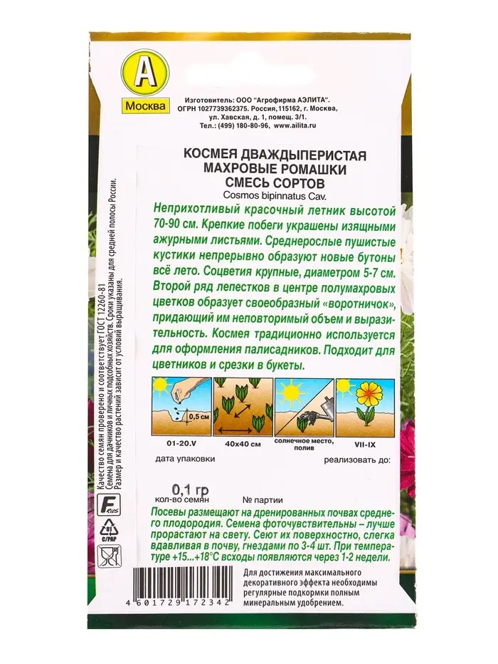 Семена цветов Космея Махровые ромашки, смесь сортов Золотая серия, Ц/П,0,1 г