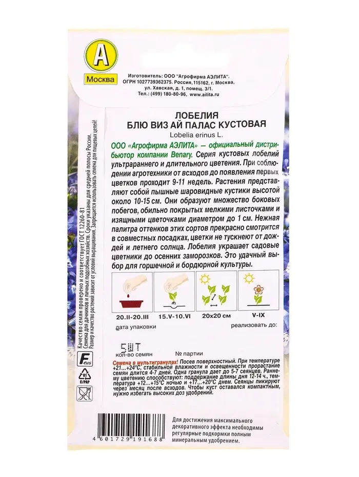Семена цветов Лобелия Блю виз ай палас кустовая (драже в пробирке) Спецсерия Benary, Ц/П,5 шт. 1094