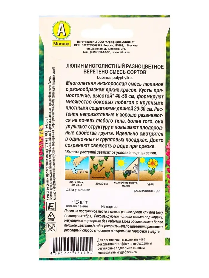 Семена цветов Люпин Разноцветное веретено, смесь сортов Мн Многолетники., Ц/П,15 шт.