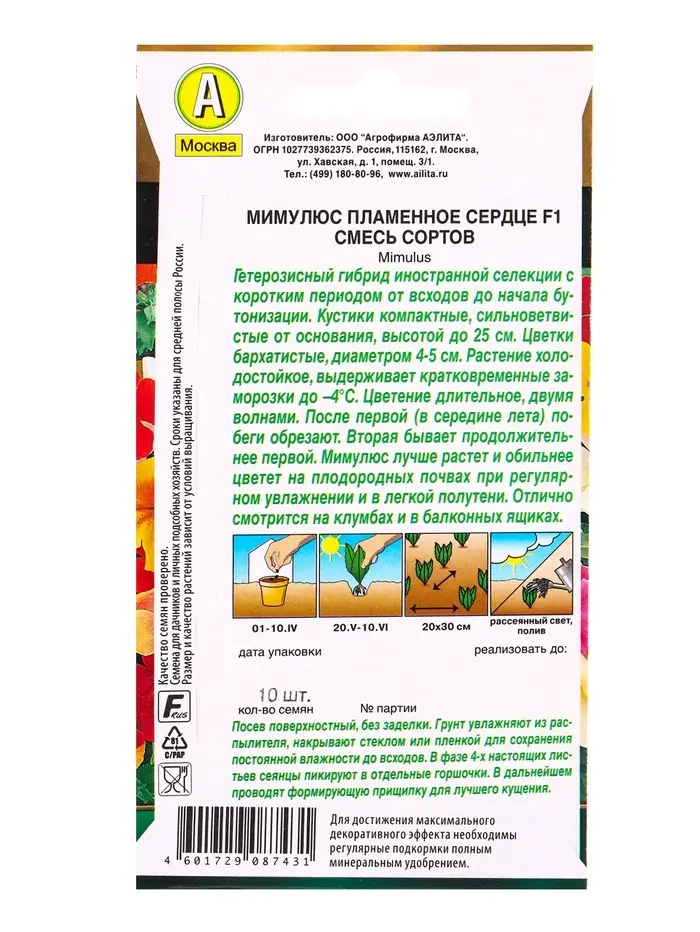 Семена цветов Мимулюс Пламенное сердце F1, смесь сортов Золотая серия, Ц/П,10 шт.