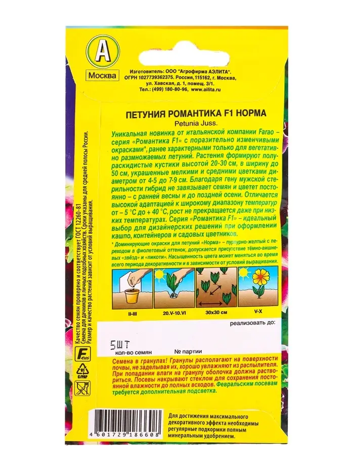 Семена цветов Петуния Романтика F1 норма (драже в пробирке) С. Farao, Ц/П,5 шт.