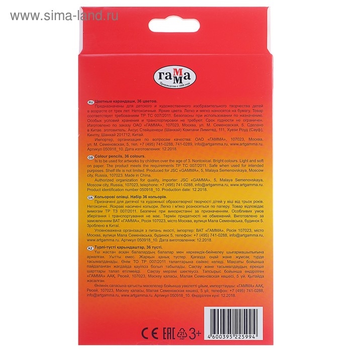 Карандаши 36 цветов Гамма "Классические", трёхгранные, d=2.6 мм, картонная упаковка, европодвес 050918_10