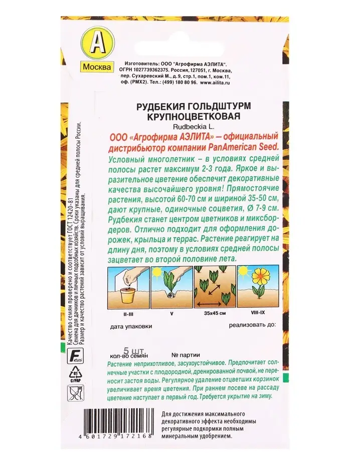 Семена цветов Рудбекия Гольдштурм крупноцветковая Мн Спецсерия PanAmerican, Ц/П,5 шт.