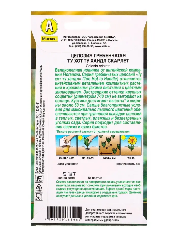 Семена цветов Целозия гребенчатая Ту хот ту хандл скарлет С. Floranova , Ц/П,5 шт.