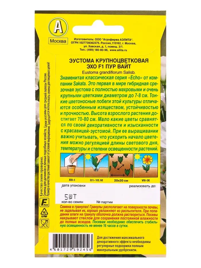 Семена цветов Эустома Эхо F1 пур вайт крупноцветковая (драже в пробирке) С. Sakata, Ц/П,5 шт. 10945