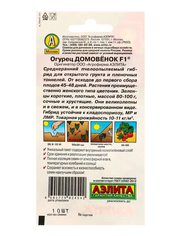 Семена Огурец Домовенок F1 Пч, Ц/П,10 шт.