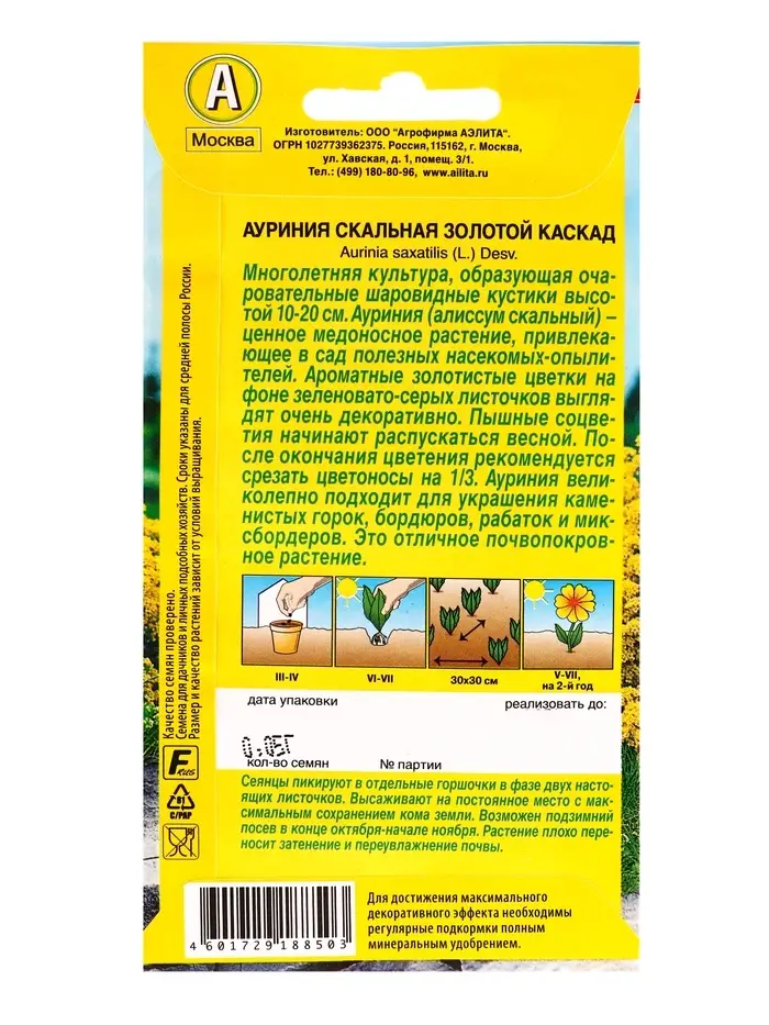 Семена цветов Ауриния скальная Золотой каскад , Ц/П,0,05 г