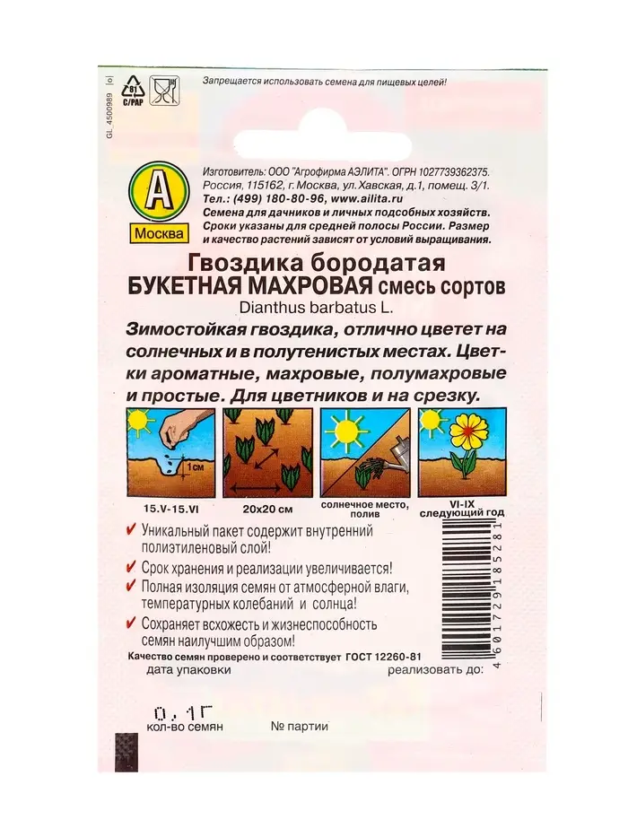 Семена цветов Гвоздика Букетная махровая, смесь сортов Дв, Лидер,0,1 г