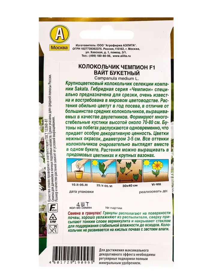 Семена цветов Колокольчик Чемпион F1 вайт букетный (драже) С. Sakata , Ц/П,4 шт.
