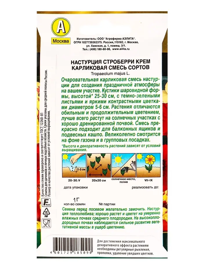 Семена цветов Настурция Строберри крем карликовая, смесь сортов Золотая серия, Ц/П,1 г