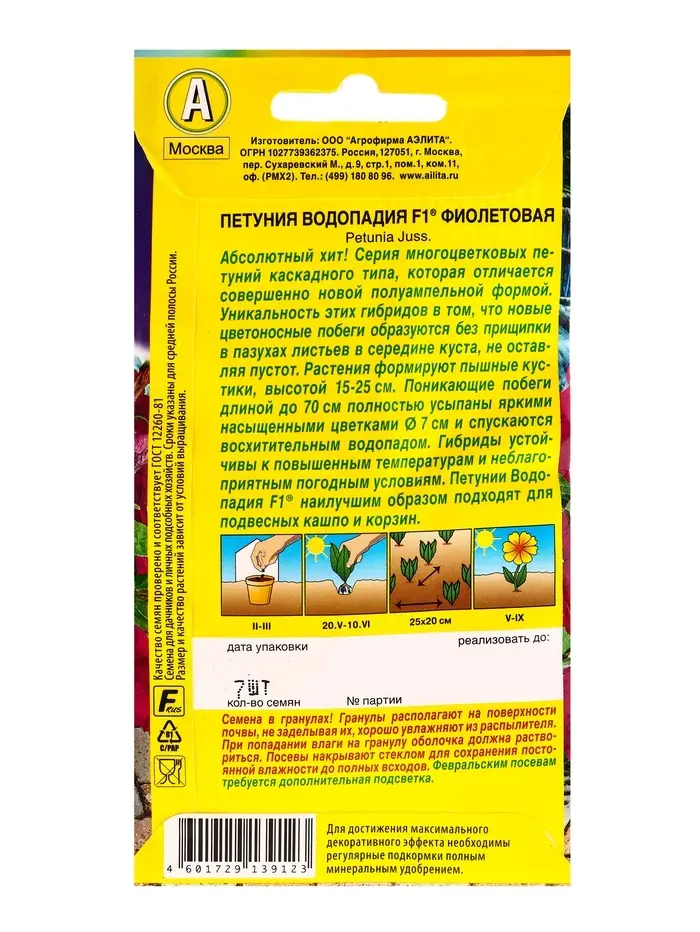 Семена цветов Петуния ВОДОПАДИЯ F1 фиолетовая (драже в пробирке), Ц/П,7 шт.