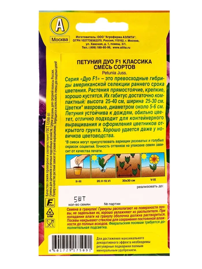 Семена цветов Петуния Дуо F1 классика многоцветковая махровая, смесь сортов (драже), Ц/П,5 шт. 1094