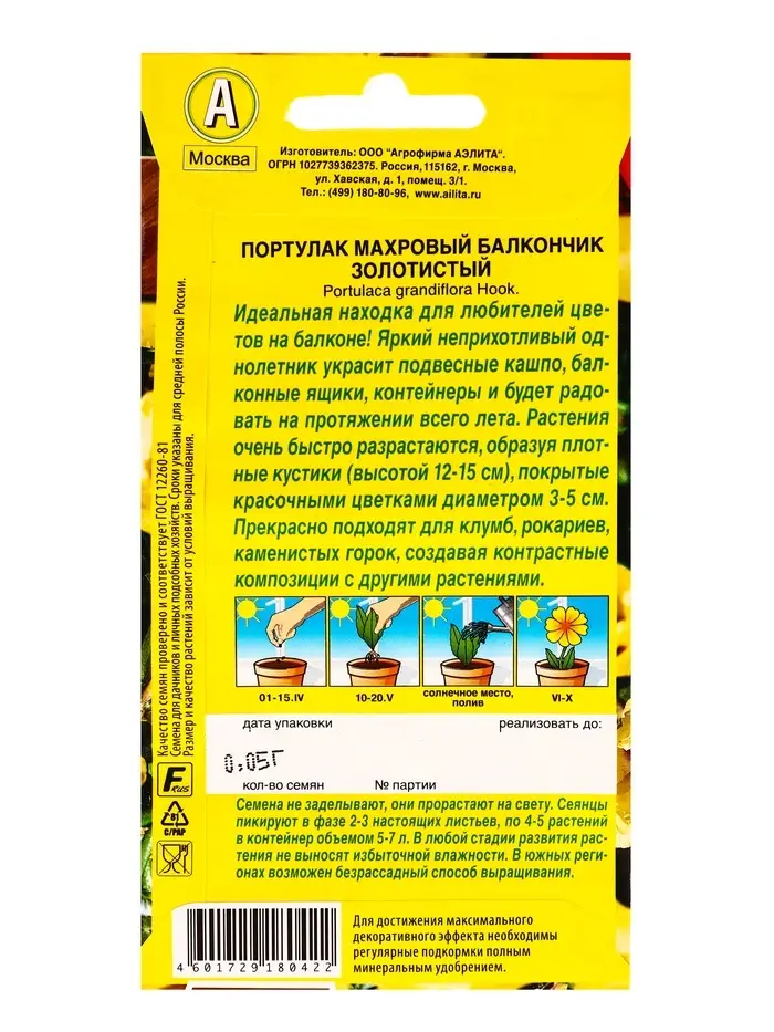 Семена цветов Портулак махровый Балкончик золотистый Цветущий балкон, Ц/П,0,05 г