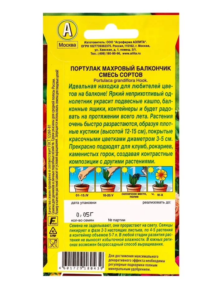 Семена цветов Портулак махровый Балкончик, смесь сортов Цветущий балкон, Ц/П,0,05 г