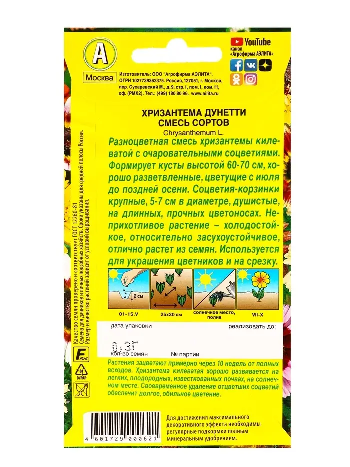 Семена цветов Хризантема Дунетти, смесь сортов , Ц/П,0,3 г